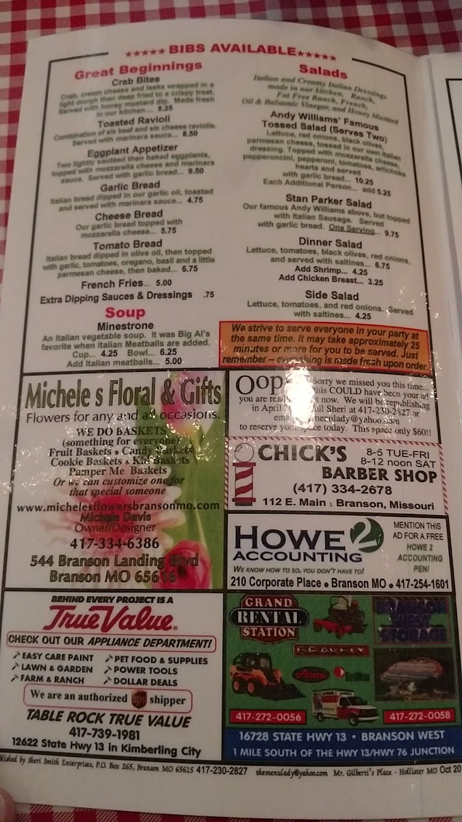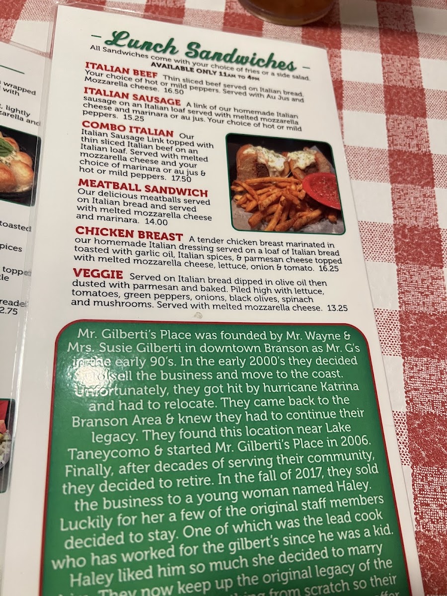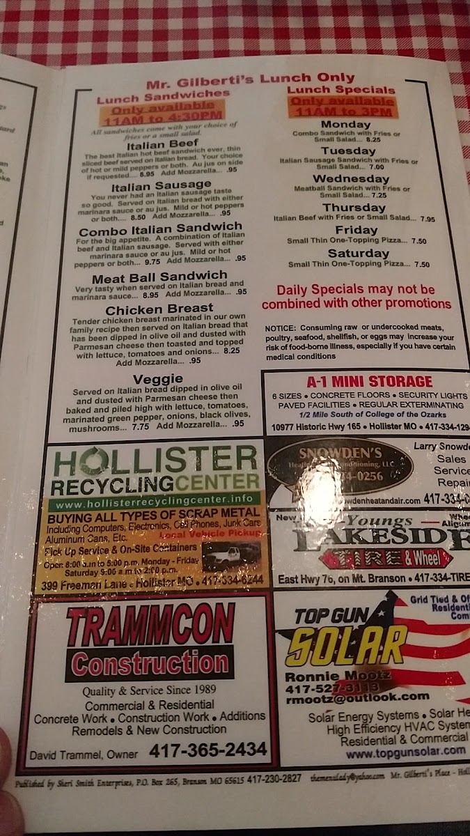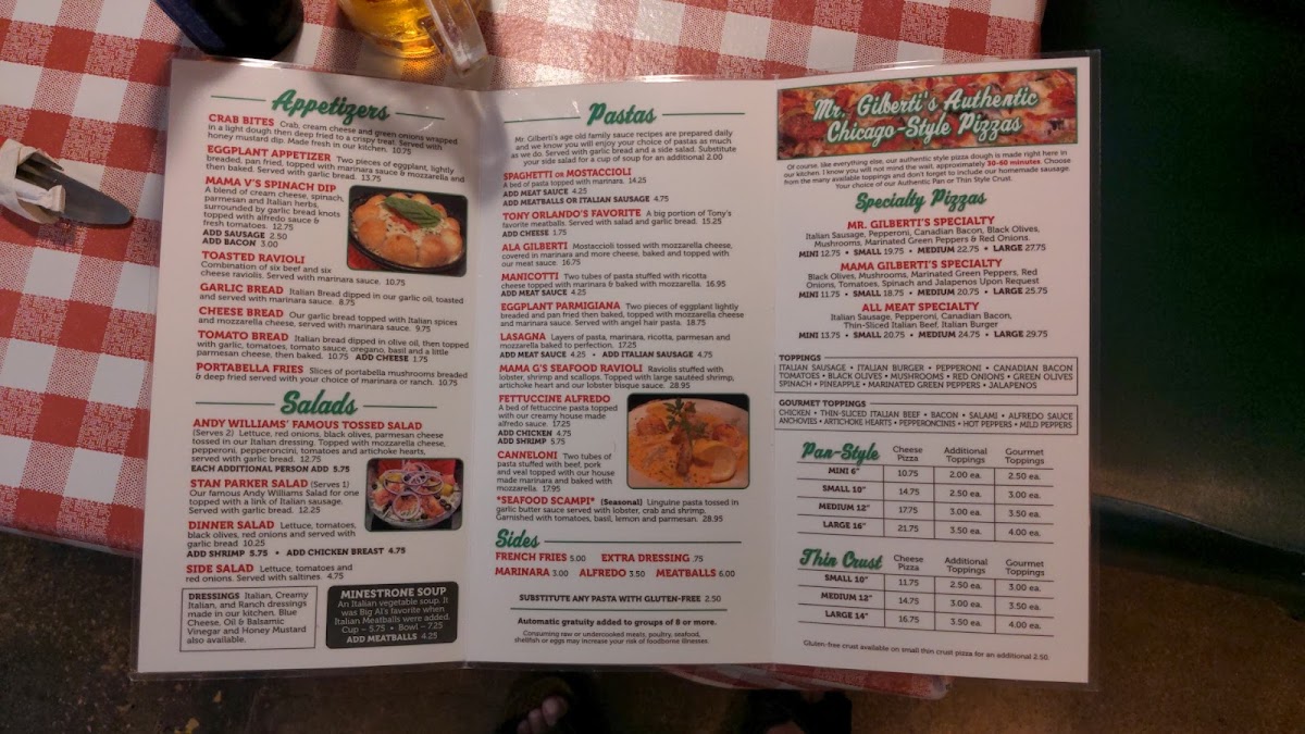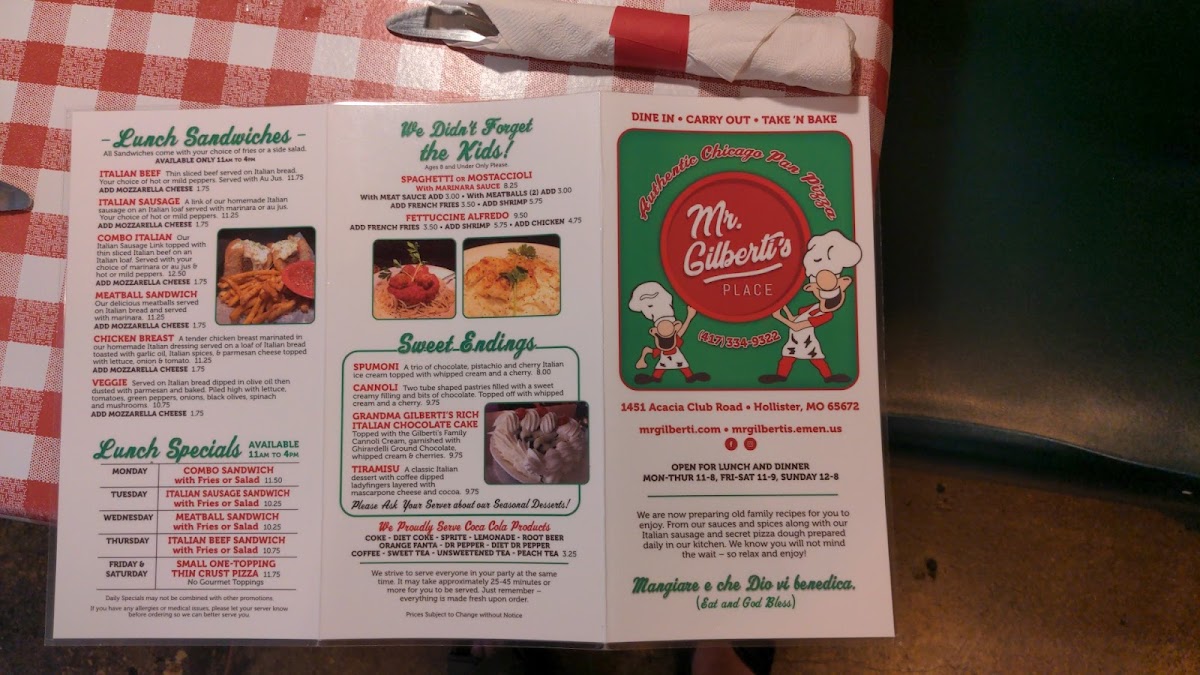 Mr. Gilberti's Place Chicago Pizza offers a taste of authentic Italian cuisine in Hollister, MO. The menu shines with a selection of specialty pizzas, highlighting the renowned All Meat Specialty and the signature Mr. Gilberti's Specialty, both crafted with homemade meats and a perfectly crispy crust.